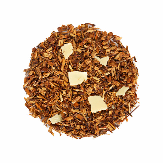Rooibos med smak av choklad och gräddkola. Vackert dekorerat med vit choklad.