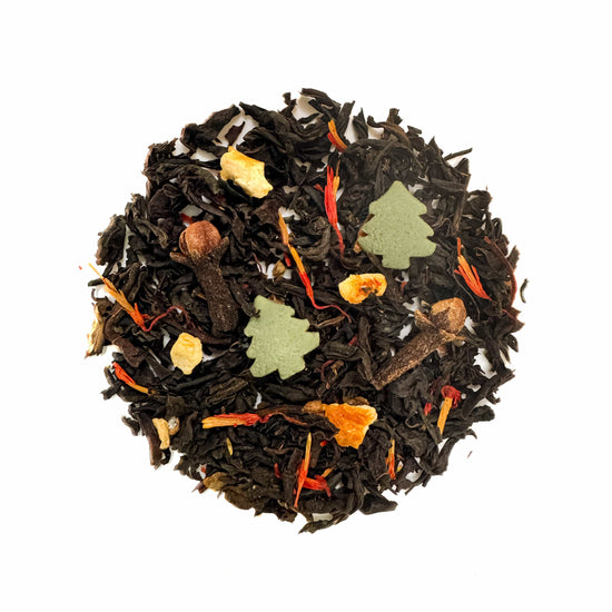 Black tea with flavours of orange, clove, cinnamon, and ginger. Decorated with orange pieces and sweet sugar fir trees.